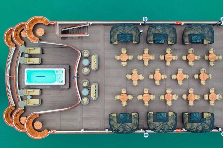 For youthful tourists, the Genz Cruise, one of the biggest vessels in Halong Bay, provides a memorable experience. Along with enjoyable activities like swimming, boat jumping, beach volleyball, football, kayaking, and water trampolines, it provides a stunning tour of Halong Bay. This party and activity package is ideal for anyone looking for adventure, stunning surroundings, and new acquaintances. Launched in September 2017, the Cruise is equipped with advanced technology, making it a highlight of your Vietnam trip.